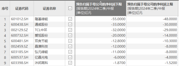 光伏主产业链价格整体下行,各环节厂商纷纷陷入“失血”状态。在释出业绩预告的上市公司中,上半年业绩亏损上限超过10亿元的企业有5家。其中隆基绿能亏损额大幅领先,通威股份(600438.SH)中报归母净利润预亏30-33亿元,亏损额位列第二。