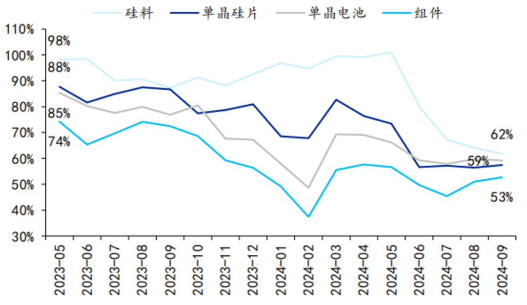 华安证券指出,光伏主产业链代表公司的净利率从2023年第三季度的10%上下开始快速下滑,去年第四季度进入本轮光伏下行周期的第一个亏损季度。同时,光伏产能利用率也从2023年中的74%—98%降至2024年中的53%—62%。