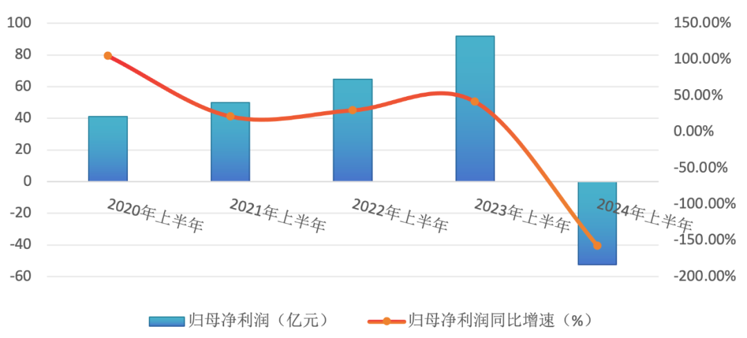 隆基绿能2020年上半年至2024年上半年归母净利润及同比增速(亿元、%)