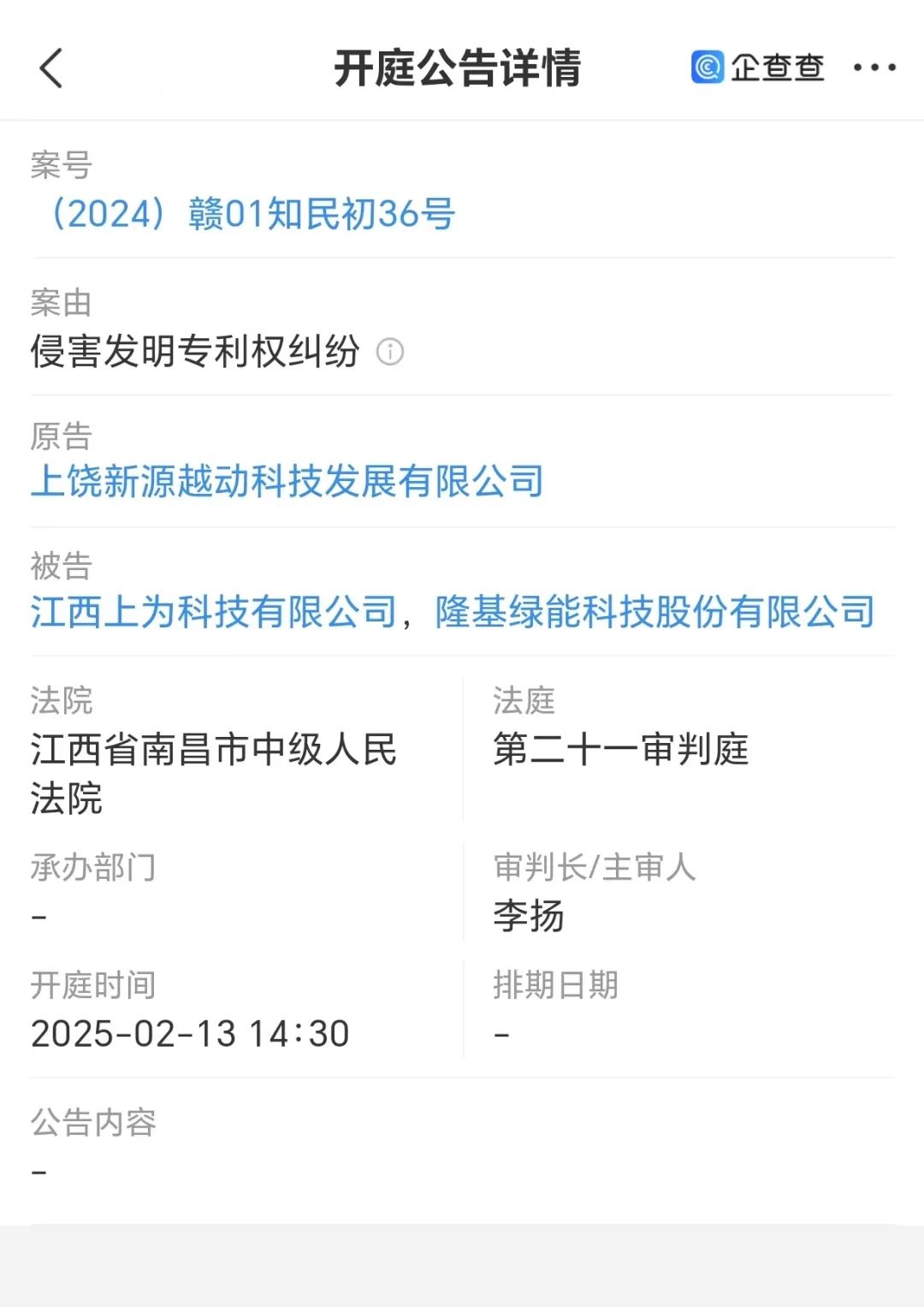确实有针对隆基绿能的一则案件,该案件为侵害发明专利权纠纷,将于2025年2月13日开庭。此次诉讼的原告是上饶新源越动科技发展有限公司,该公司为晶科能源全资子公司。除了隆基绿能之外,还有另一个被告为江西上为科技有限公司,该公司位于南昌市西湖区,去年8月才成立,注册资金50万元,单一股东为李嵩松。