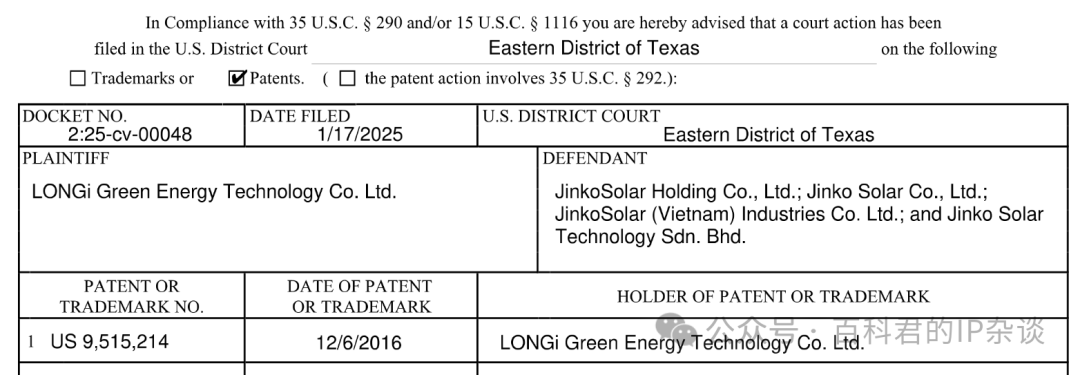 近期,隆基绿能在美国德州东院,又诉了晶科能源专利侵权,涉诉专利约为US9515214。