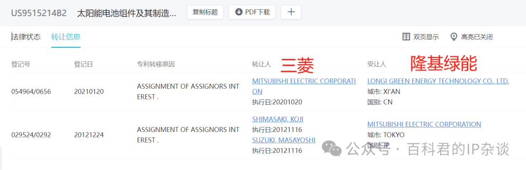 有意思的是,这件专利也是隆基绿能从三菱电子那边,于2021年受让过来的。