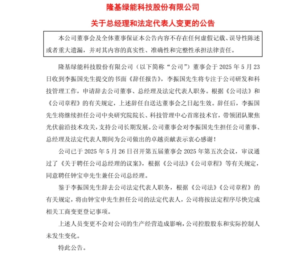 5月27日,隆基绿能发布公告称,公司创始人李振国将专注于公司研发和科技管理工作,已申请辞去公司董事、总经理及法定代表人职务,公司董事长钟宝申将兼任总经理一职,并接任公司的法定代表人。