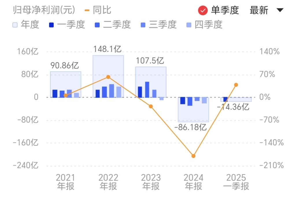 整体来看,公司2025年一季度实现营业收入136.52亿元,同比下降22.75%;净利润为-14.36亿元,上年同期亏损23.5亿元。时间线拉长,自2023年四季度以来公司便持续亏损,累积亏损金额达110亿元。