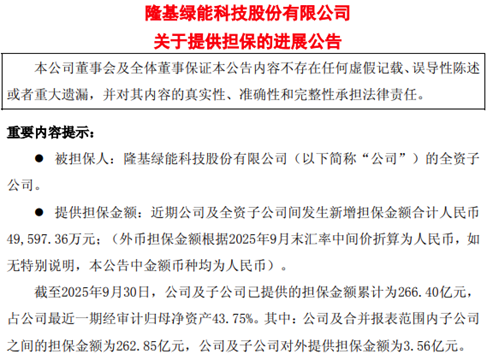 公司法规定:上市公司对外担保总额不得超过最近一期经审计净资产的50%。然而今年10月13日,光伏巨头隆基绿能(股票代码601012)公告其累计担保266亿元(含子公司),已占最近一期经审计净资产的43.75%。