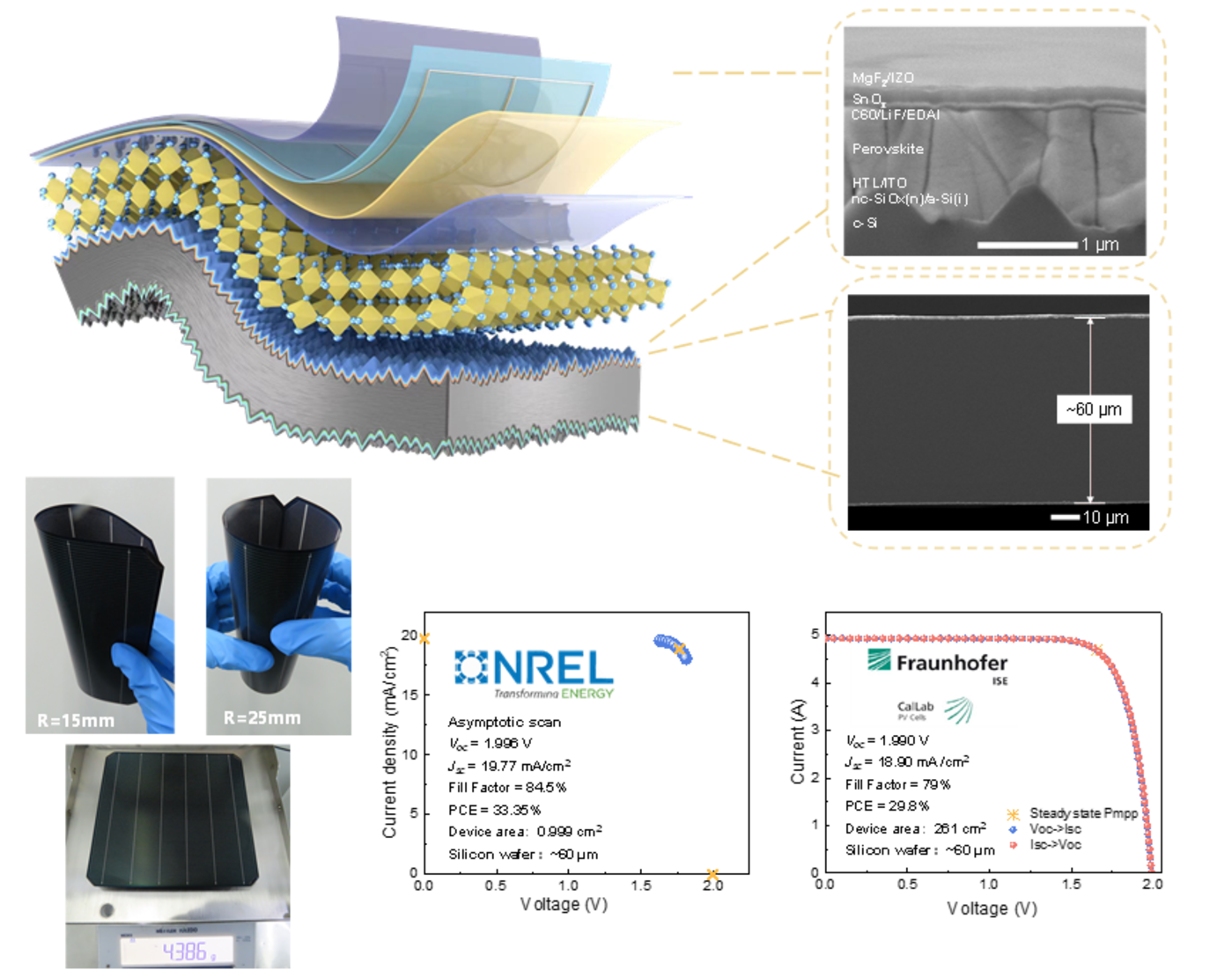 实验结果是:在超薄硅片上构建的柔性叠层器件,不仅可以实现小弯曲半径的反复弯折,而且在实验室小面积上做到了33.4%的转换效率,刷新了柔性硅基叠层电池的世界纪录。