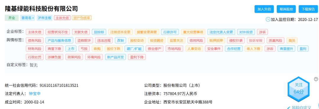 最后,根据AI风险控制系统“RiskRaider风险雷达”的风控监控数据,观测AI对隆基绿能的风险信息,部分截图如下: