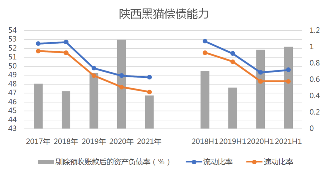 从半年报来看,2018年至2021年上半年,陕西黑猫的流动比率分别为1.07、0.92、0.69、0.72,2021年上半年公司流动比率较2020年同期相比有所上升。速动比率分别为0.93、0.82、0.58、0.58,2021年上半年公司速动比率较2020年同期相比持平。剔除预收账款后的资产负债率分别为49.47%、47.61%、51.85%、52.20%,2021年上半年公司剔除预收账款后的资产负债率较2020年年同期相比有所上升。