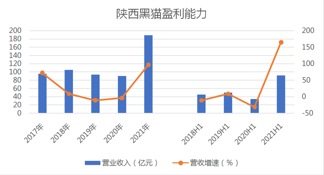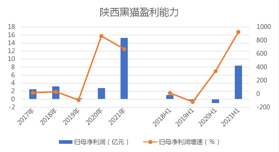 从半年报来看,2018年至2021年上半年,陕西黑猫的归母净利润分别为1.05亿元、-0.21亿元、-0.92亿元、8.38亿元,2021年上半年公司归母净利润较2020年同期相比有所上升,归母净利润由负转正。归母净利润增速分别为13.44%、-119.94%、-339.76%、926.86%,2021年上半年公司归母净利润增速较2020年同期相比有大幅度上升,归母净利润增速由负转正。营业收入分别为45.43亿元、49.61亿元、34.33亿元、91.27亿元,2021年上半年公司营业收入较2020年同期相比有所上升。营收增速分别为-10.88%、9.22%、-30.79%、165.19%,2021年上半年公司营收增速较2020年同期相比有大幅度上升,营收增速由负转正。