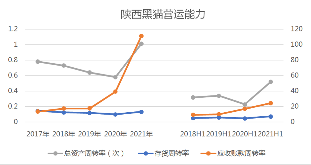 从半年报来看,2018年至2021年上半年,陕西黑猫的存货周转率分别为5.28、6.12、4.90、7.29,2021年上半年公司存货周转率较2020年同期相比有所上升。应收账款周转率分别为9.43、10.17、17.19、24.41,2021年上半年公司应收账款周转率较2020年同期相比有所上升。总资产周转率分别为0.32次、0.34次、0.23次、0.52次,2021年上半年公司总资产周转率较2020年同期相比有所上升。