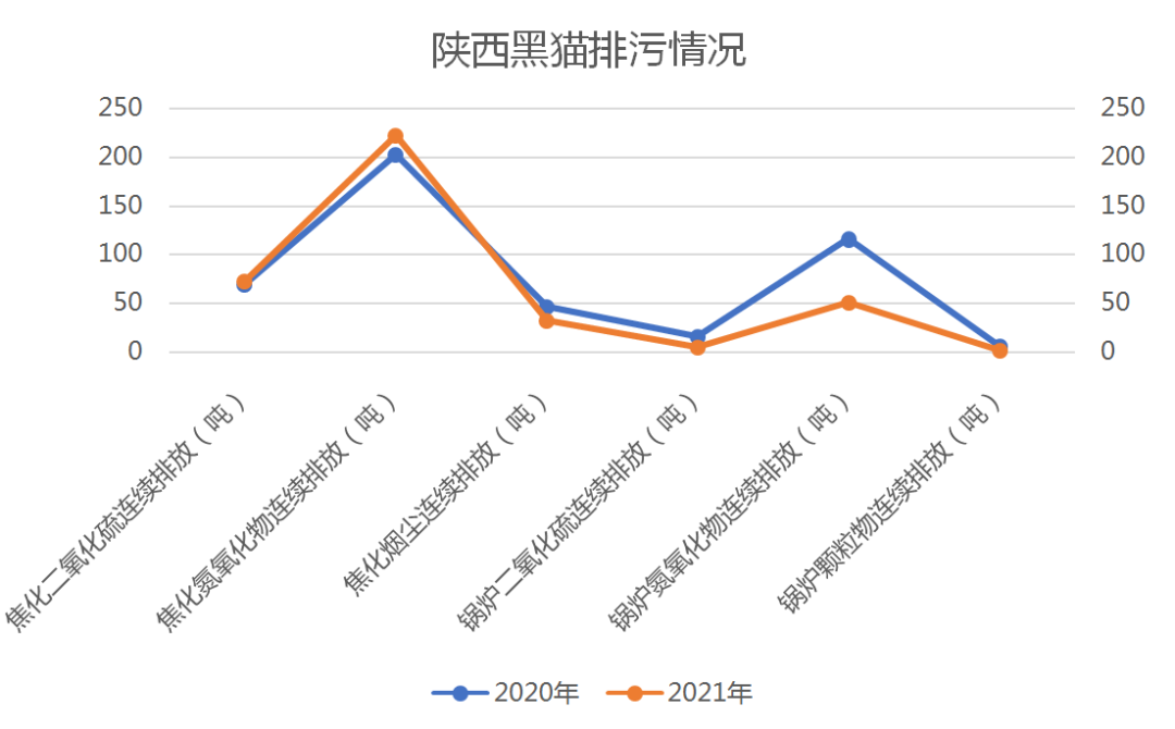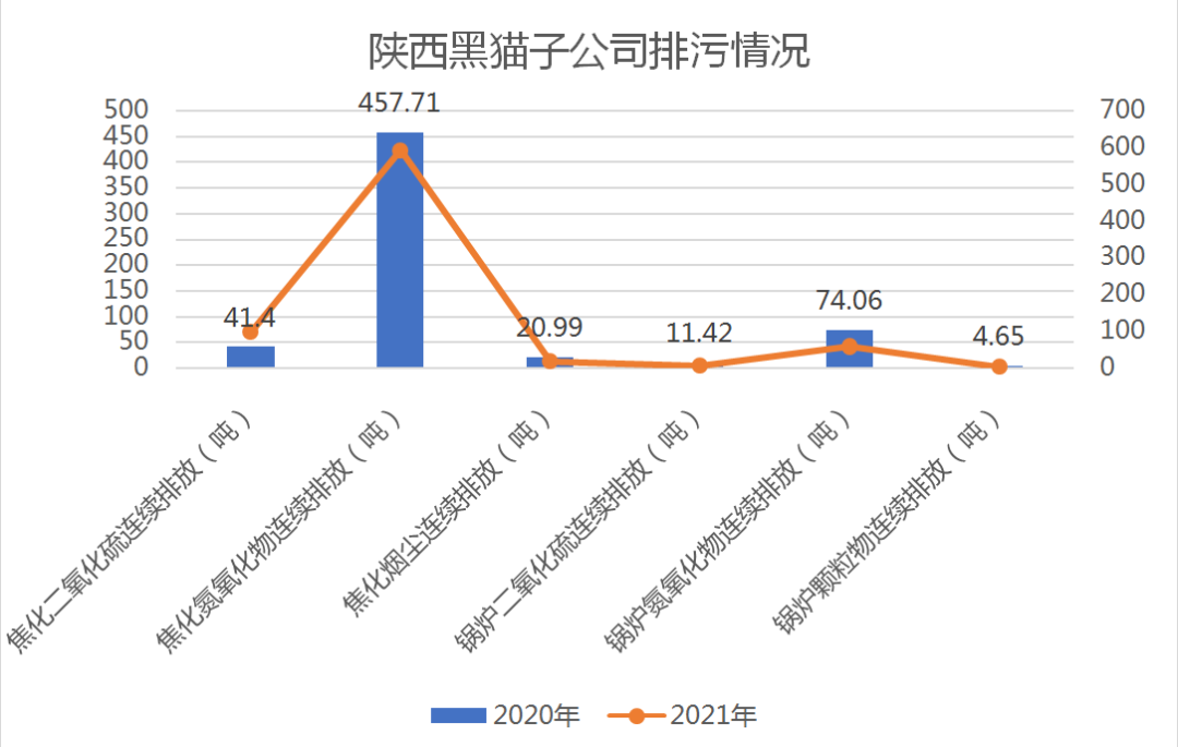 从排污情况来看,2020-2021年,陕西黑猫子公司(龙门煤化)焦化二氧化硫连续排放量分别为41.4吨、96.73吨,焦化氮氧化物连续排放量分别为457.71吨、591.33吨,2021年公司焦化二氧化硫连续排放量和焦化氮氧化物连续排放量较2020年同期相比均有所上升,焦化烟尘连续排放量分别为20.99吨、18.34吨,锅炉二氧化硫连续排放量分别11.42吨、5.54吨,锅炉氮氧化物连续排放量分别为74.06吨、57.79吨,锅炉颗粒物连续排放量分别为4.65吨、3.34吨,2021年公司焦化烟尘连续排放量,锅炉二氧化硫连续排放量,锅炉氮氧化物连续排放量,锅炉颗粒物连续排放量较2020年同期相比均有所下降。