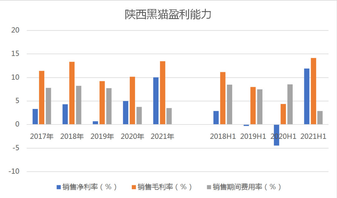 从半年报来看,2018年至2021年上半年,陕西黑猫的销售净利率分别为2.90%、-0.31%、-4.47%、11.90%,2021年上半年公司销售净利率较2020年同期相比有大幅度上升,销售净利率由负转正。销售毛利率分别为11.16%、8.01%、4.35%、14.16%,2021年上半年公司销售毛利率较2020年同期相比有大幅上升。销售期间费用率分别为8.48%、7.47%、8.55%、2.87%,2021年上半年公司销售期间费用率较2020年同期相比有所下降。