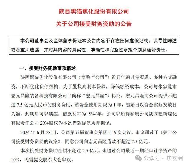 6月29日,陕西黑猫(601015,SH)发布公告称,公司与张家港市宏元昌隆装备科技有限公司(简称“宏元昌隆”)协商,宏元昌隆向公司提供不超过7.5亿元人民币的财务资助。