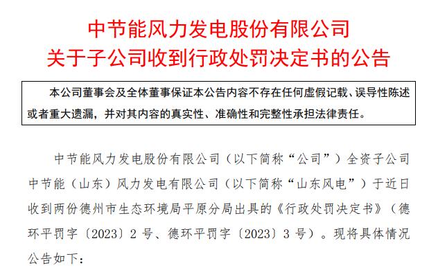 节能风电24日发布公告称,因擅自开工建设、环境保护设施未经验收等原因,子公司山东风电收到两份《行政处罚决定书》。