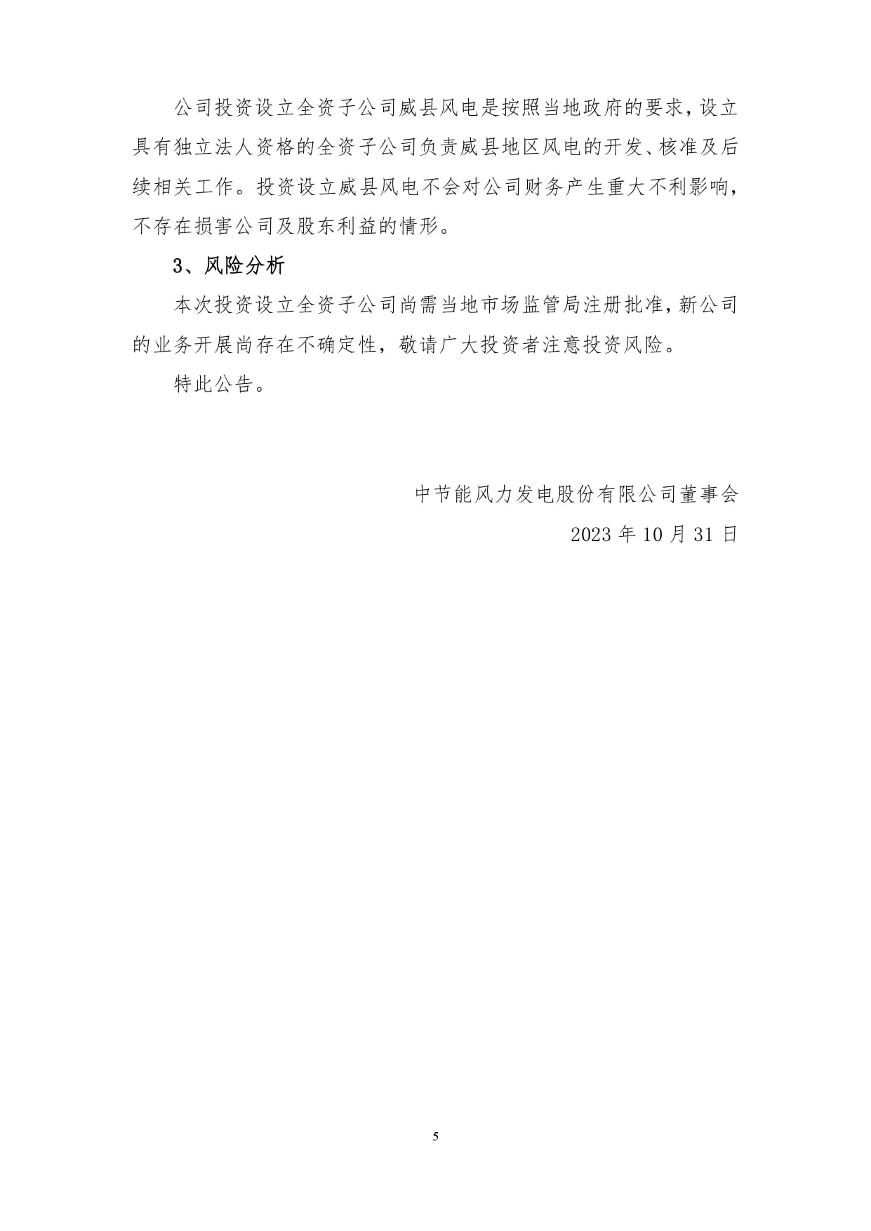 根据公告显示,节能风电于2023年10月30日召开第五届董事会第十六次会议审议通过了《关于投资建设中节能甘州平山湖百万千瓦风电基地10万千瓦风电 6#项目的议案》、《关于投资设立中节能(威县)风力发电有限公司的议案》。