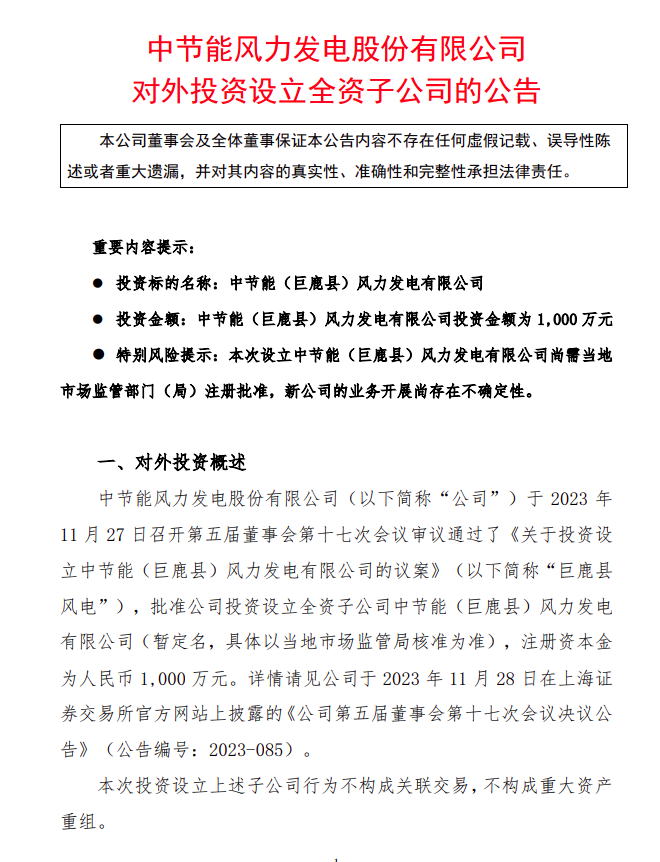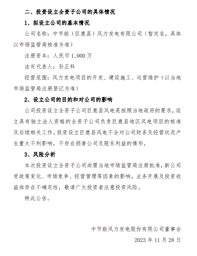 根据公告显示,节能风电拟投资设立全资子公司中节能(巨鹿县)风力发电有限公司,注册资本金为人民币1,000万元。经营范围:风力发电项目的开发、建设施工、运营维护(以当地市场监管局注册登记为准)