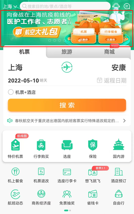 为致敬全国各地的医护工作者、各行各业的志愿者义无反顾奔赴抗疫一线,日夜守护群众生命健康安全。5月8日,春秋航空宣布向援沪医务工作者及在上海参与抗疫的志愿者(大白)赠送春秋航空爱心航旅礼包。
