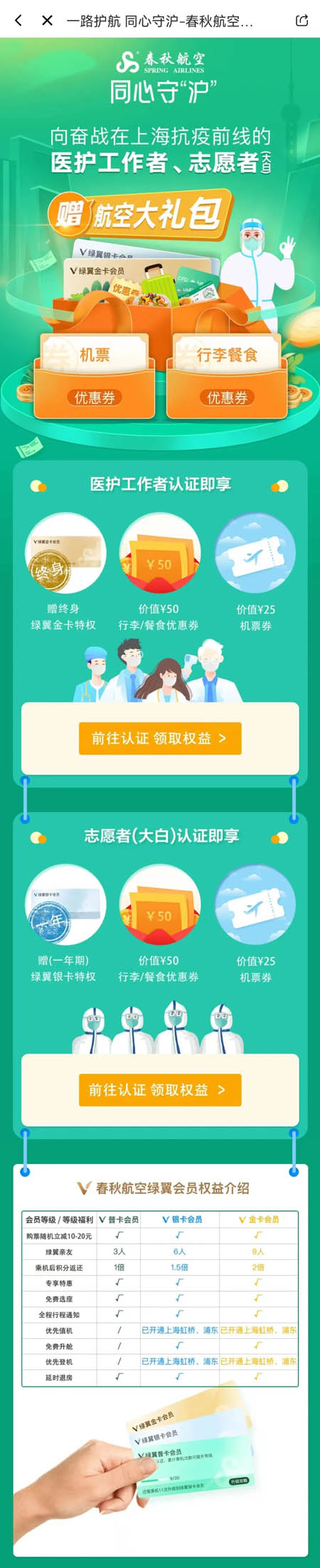 春秋航空赠送的爱心航旅礼包,包含绿翼会员金卡、银卡、机票优惠券和行李餐食优惠券等航空福利。其中,援沪医务工作者将获得绿翼会员终身金卡权益,而奋战在各社区的志愿者(大白)则将获得绿翼会员银卡权益。