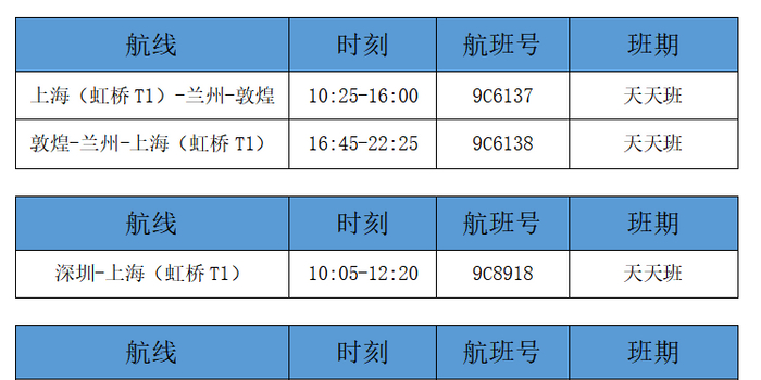 6月10日恢复的上海虹桥—兰州中川—敦煌莫高航线,航班号为9C6137/38,6月12日恢复的深圳宝安—上海虹桥航线,航班号为9C8918。6月15日恢复的上海虹桥—西宁曹家堡航线,航班号为9C6833/34。以上三条航线恢复后每天一班,由空客A320执飞。