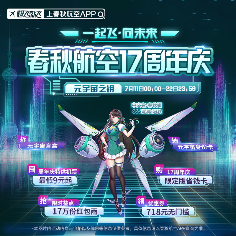 春秋航空以“让普通大众坐得起飞机”为使命,已经陪伴用户走过17年,为了感恩回馈用户,近日,“春秋航空一起飞·向未来”17周年庆盛典在春秋航空直销渠道正式启动。此次周年庆活动,春秋航空首位二次元机娘“春秋姬”IP形象与元宇宙融合,不仅秉持产品价格让利、而且更注重用户的参与感,还面向广大消费者推出了百余条热门航线9元起秒杀,17万份红包雨、718元大额优惠券,抽身份盲盒、17周年限定版省钱卡、NFT数字藏品,学生福利等多种优惠好礼,全力推动暑期航空市场回暖。