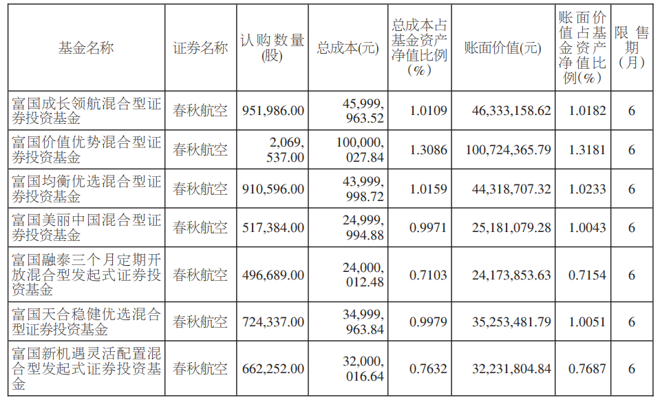 春秋航空股份有限公司已发布《春秋航空非公开发行股票发行情况报告书》,公布了本次非公开发行结果。富国基金现将旗下证券投资基金投资此非公开发行股票的相关情况公告如下: