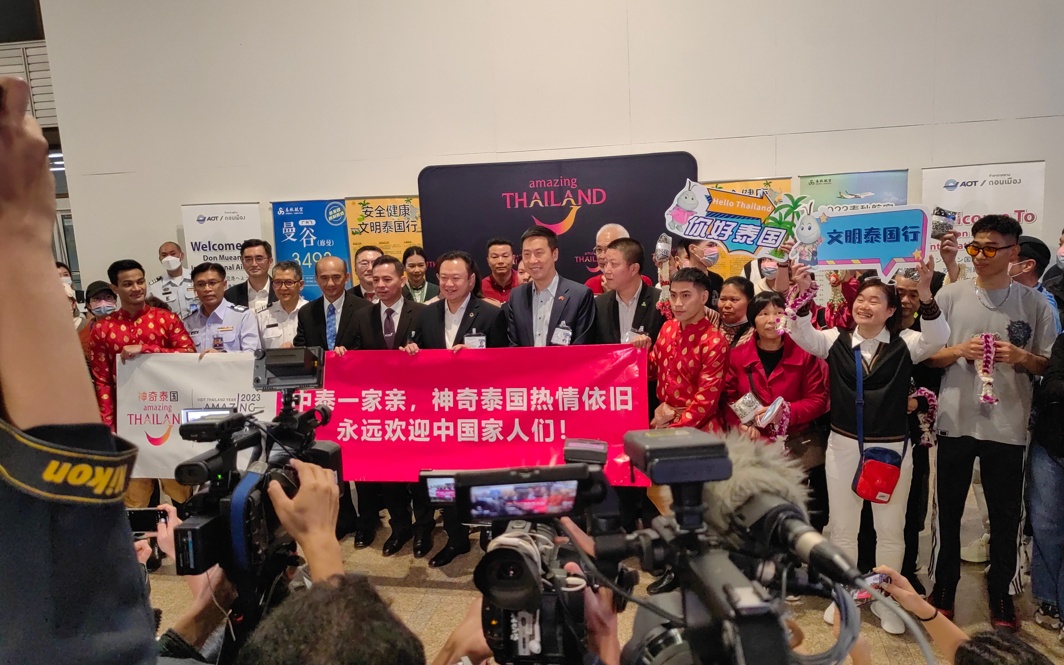 2月6日8时05分,搭乘春秋航空9C7419航班的近40人团队游客,从广州飞抵泰国曼谷,泰国曼谷廊曼机场为该旅行团举办了隆重热情的欢迎仪式。中国出境团队游试点恢复后,该团是在首批20个目的地国家中率先抵达的第一个旅游团。