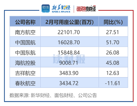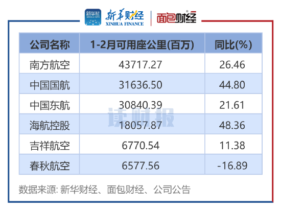 从可用座公里来看,南方航空的可用座公里同样居首,从增幅来看,除了春秋航空同比下降11.61%之外,其余5家航空公司的2月可用座公里同比均在上升。
