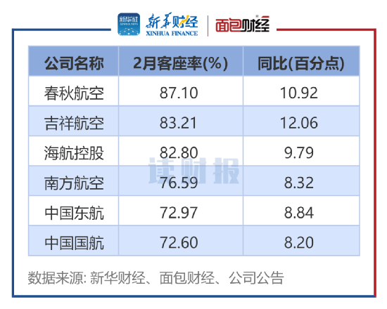 客座率:春秋航空、吉祥航空、海航控股超八成