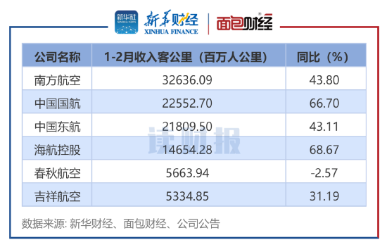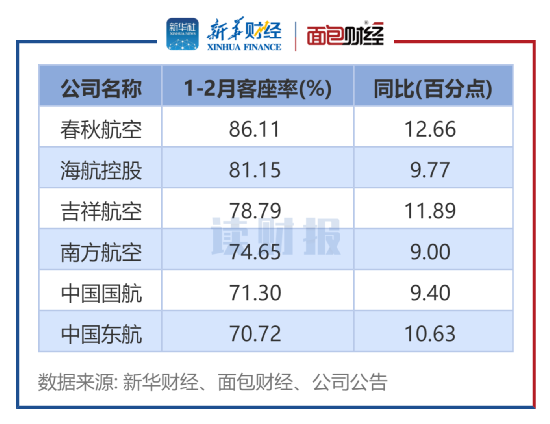 从增幅来看,6家航空公司1月-2月的客座率增幅均超过9个百分点。其中,春秋航空的同比增幅达12.66个百分点,增幅最大;吉祥航空的同比增幅为11.89个百分点,增幅排在第二位。