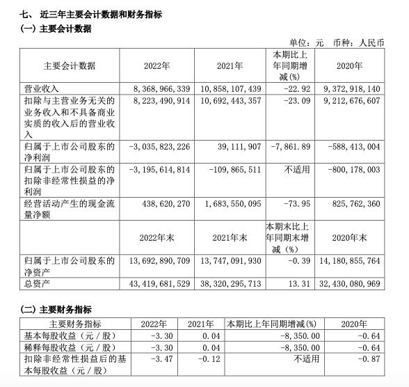 春秋航空年报称,2022年,公司实现营业收入8,368,966,339元,同比下降22.9%。主营业务收入为8,195,357,494元,同比下降23.0%,其中客运业务收入为8,101,574,919元,同比下降23.0%,货运业务收入为93,782,575元,同比下降21.5%;其他业务收入为173,608,845元,同比下降20.4%。2022年,公司实现归属于上市公司股东的净利润为-3,035,823,226元。