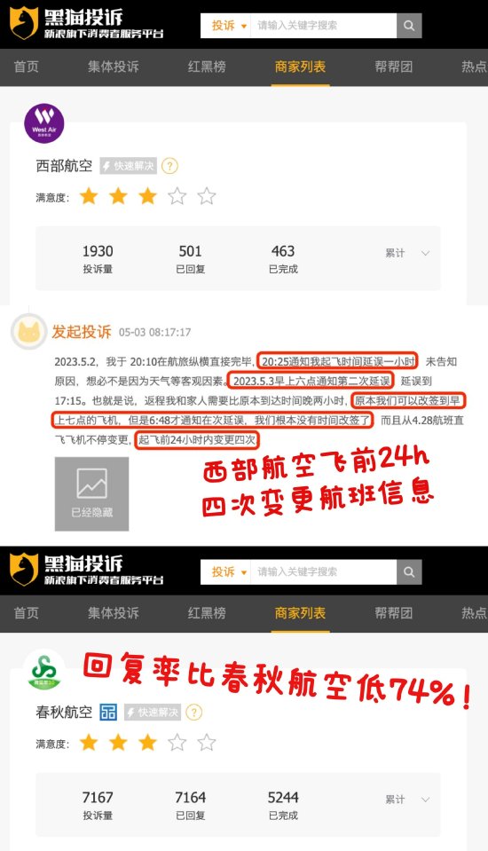 近期,有消费者通过黑猫投诉【投诉入口】平台反馈,自己购买西部航空机票后,于起飞前一天被通知航班延误,后又于起飞当天早上被通知第二次延误,由于通知时间太晚导致错过原本可改签的航班。航班飞机也是数次变更,飞前24h内变更了四次。截至目前,西部航空在黑猫投诉平台投诉累计达1930单,回复率不足26%,比春秋航空回复率低74%。