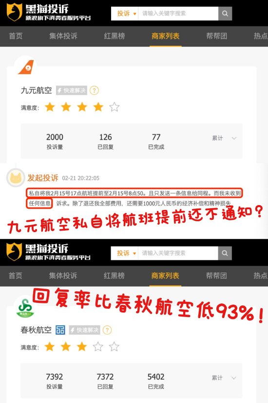 近期,有消费者通过黑猫投诉平台反馈,九元航空私自将自己的航班提前且只发送一条信息给订票平台,而自己并未收到任何信息。截至目前,九元航空在黑猫投诉平台投诉累计达2000单,回复率仅为6.3%,比春秋航空回复率低93%。