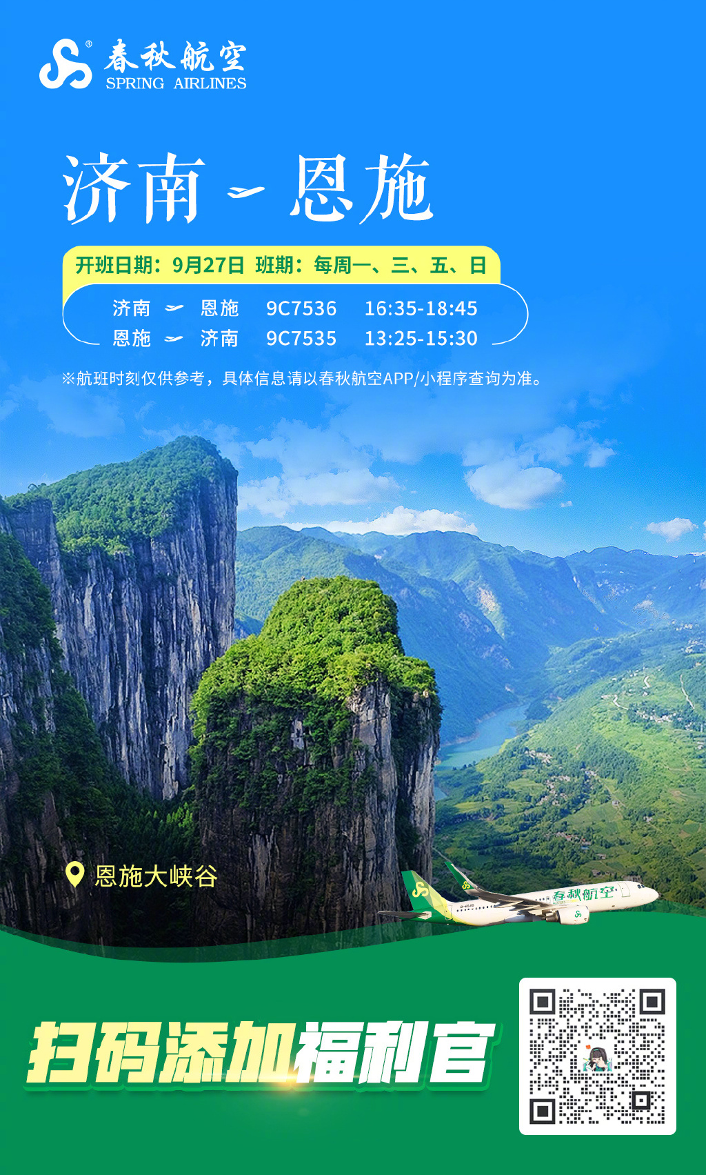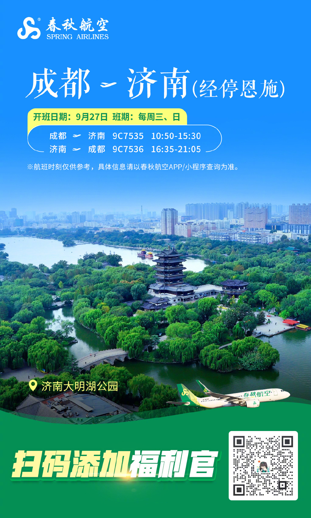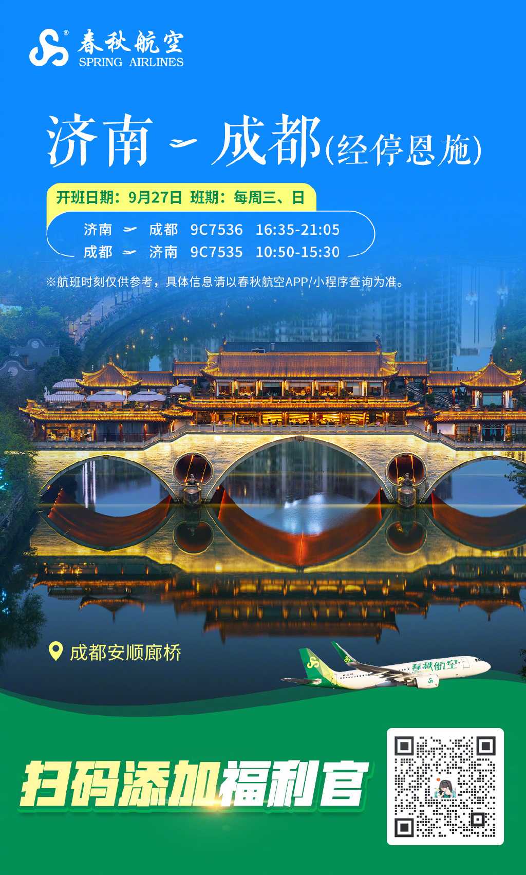 春秋航空9月将新开成都=济南、成都=恩施、济南=恩施航线。