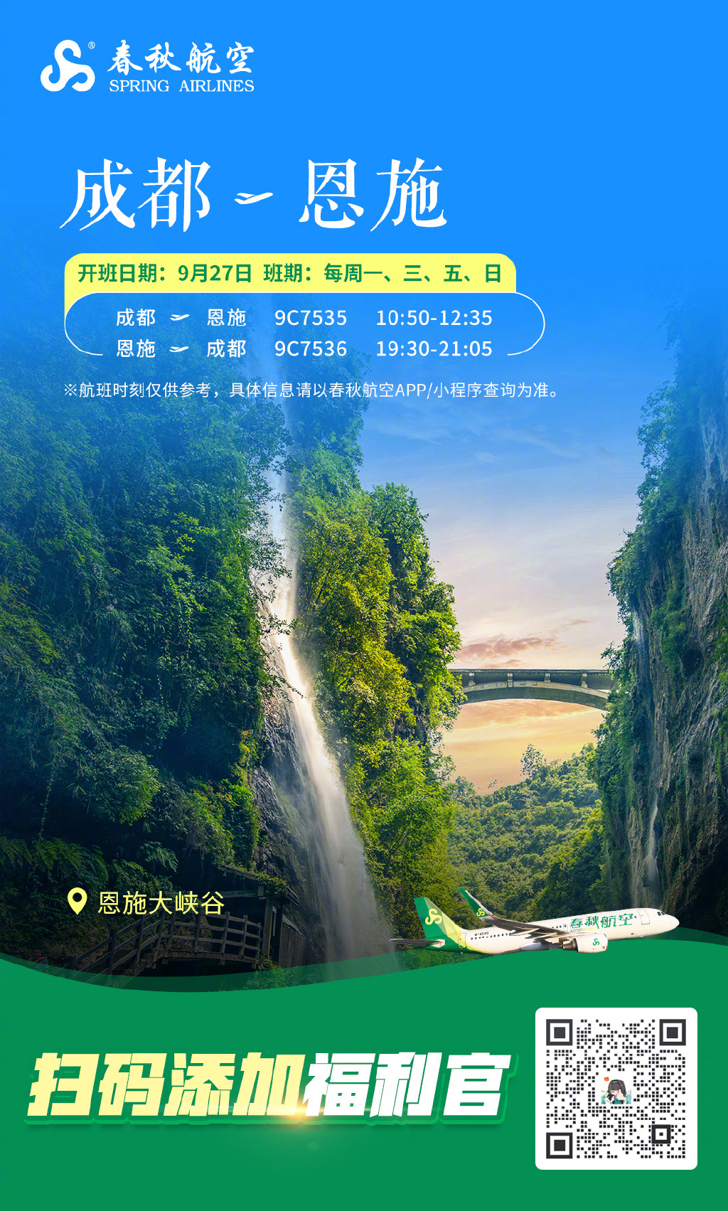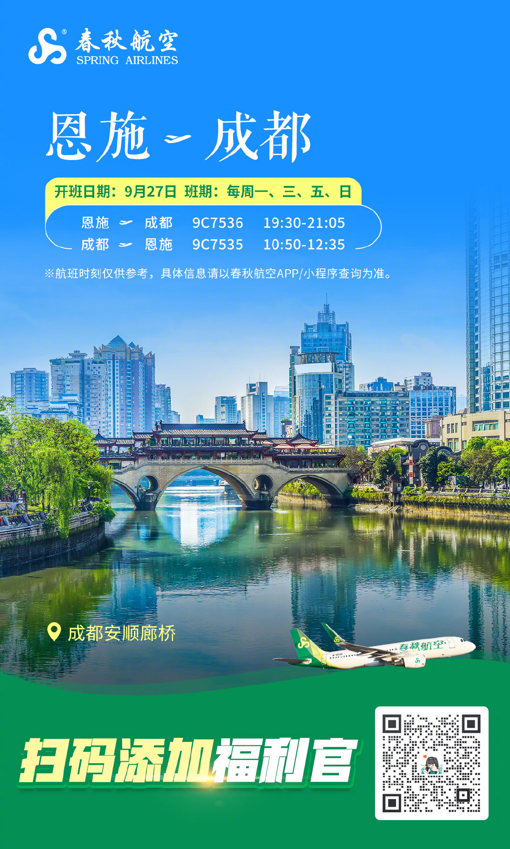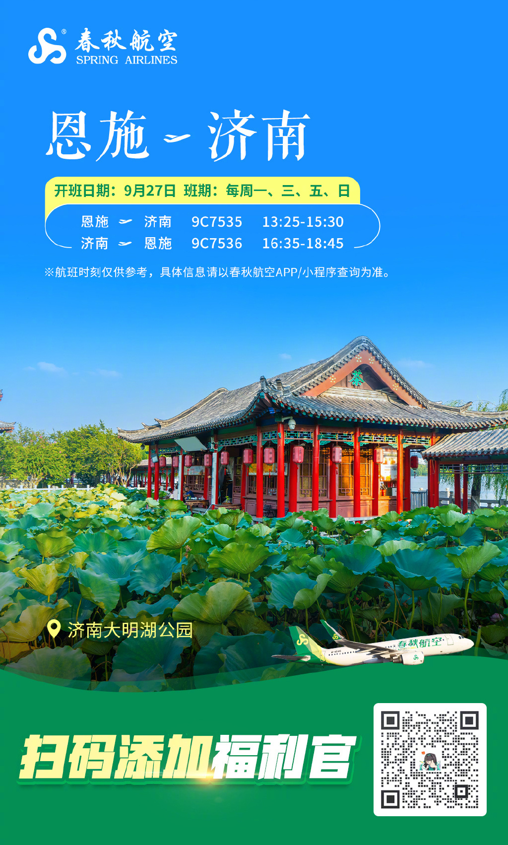 春秋航空9月将新开成都=济南、成都=恩施、济南=恩施航线。
