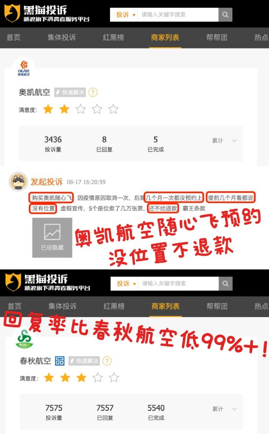 近期,有消费者通过黑猫投诉平台反馈,自己购买奥凯航空随心飞服务,几个月一次都没预约上,提前几个月看都没有位置,航司却拒绝退款。截至目前,奥凯航空在黑猫投诉平台投诉累计达3436单,回复率几乎为0,比春秋航空回复率低99%以上。