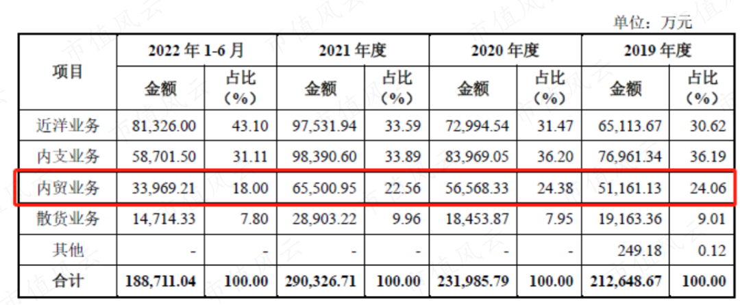 虽然近年来内贸业务销售额持续增长,但是占比却从24.38%下降至18%。