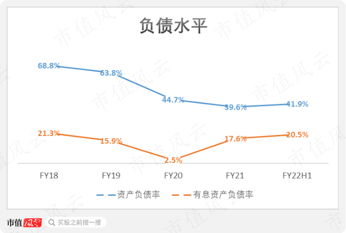 公司的资产负债率从2019年开始下降显著,目前已经降至41.9%,低于行业平均水平。而且应付账款占负债端比例较高,有息资产负债率仅有20.5%。