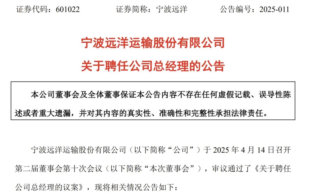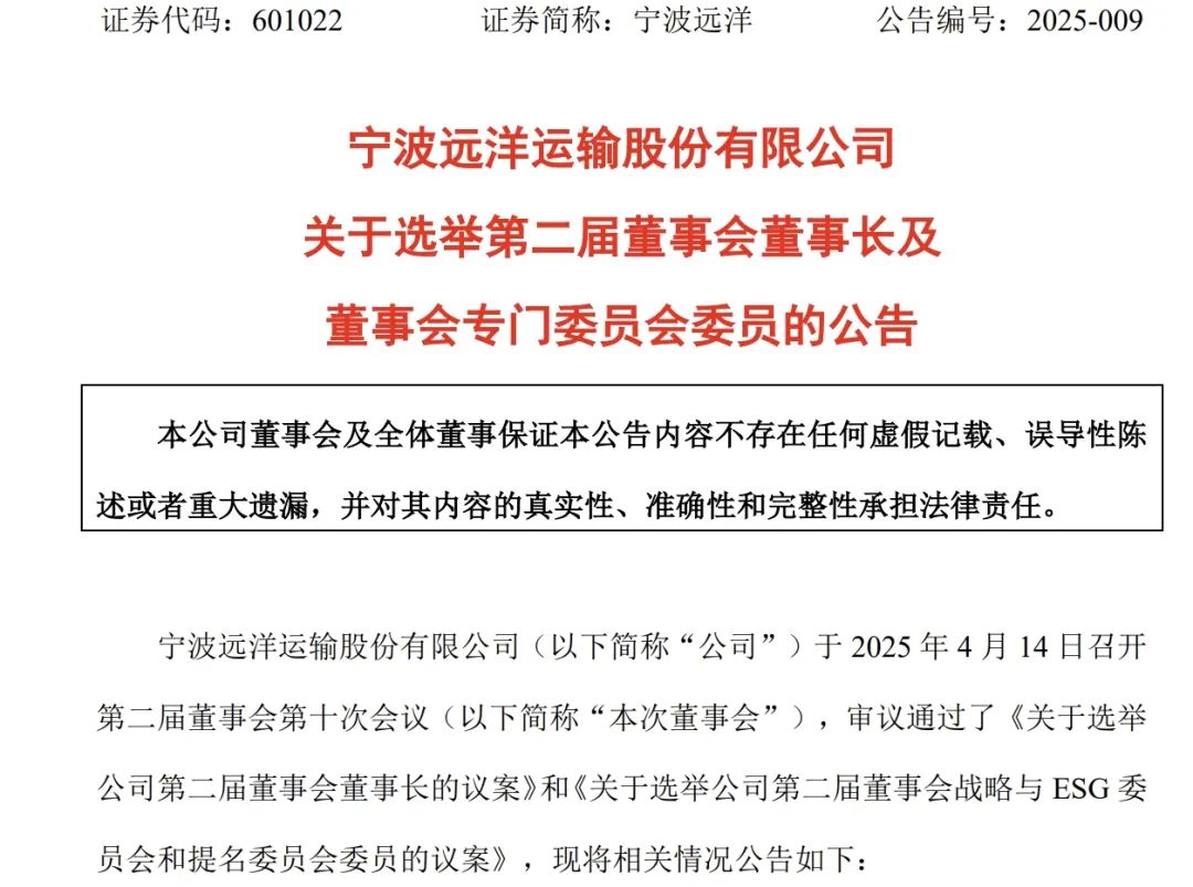 4月14日,宁波远洋运输股份有限公司(证券代码:601022,以下简称“宁波远洋”)发布公告,公司于当日召开第二届董事会第十次会议,审议通过了《关于选举公司第二届董事会董事长的议案》、《关于聘任公司总经理的议案》。