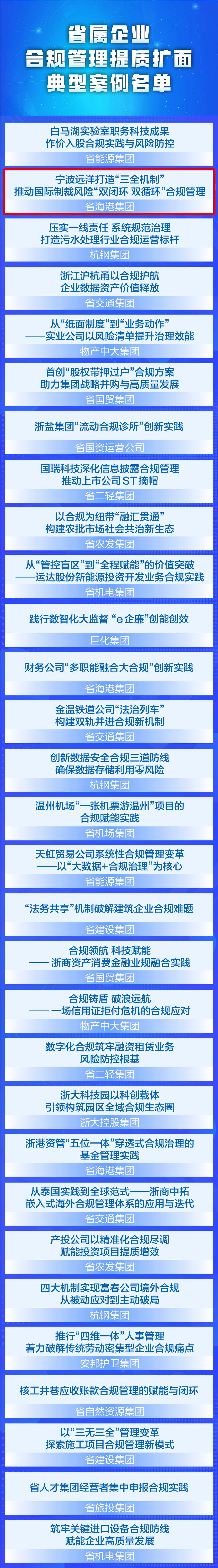 浙江省国资委公布省属企业合规管理提质扩面典型案例,《宁波远洋打造“三全机制”推动国际制裁风险“双闭环双循环”合规管理》实践成果成功入选省属企业合规管理提质扩面典型案例名单,体现了公司在推动合规体系建设中的积极探索与责任担当。