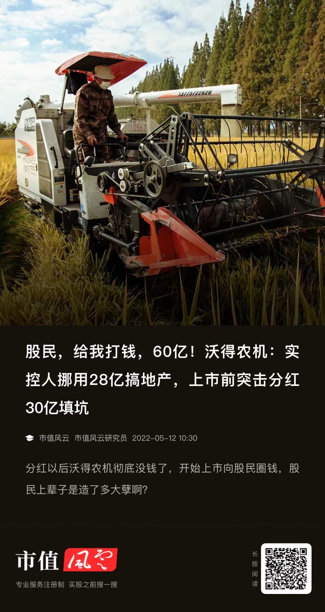 风云君此前在《股民,给我打钱,60亿!沃得农机:实控人挪用28亿搞地产,上市前突击分红30亿填坑》有过分析。
