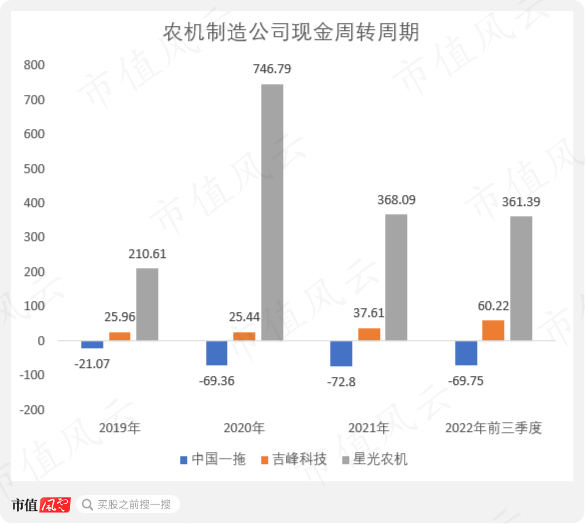 一拖这几年拥来有130天以上的应付账款周转天数,但其存货周转天数不到3个月,应收账款周转天数更是不到2个月,三项指标均大幅优于可比公司,三年来一拖的现金周转周期始终维持在-70天左右。