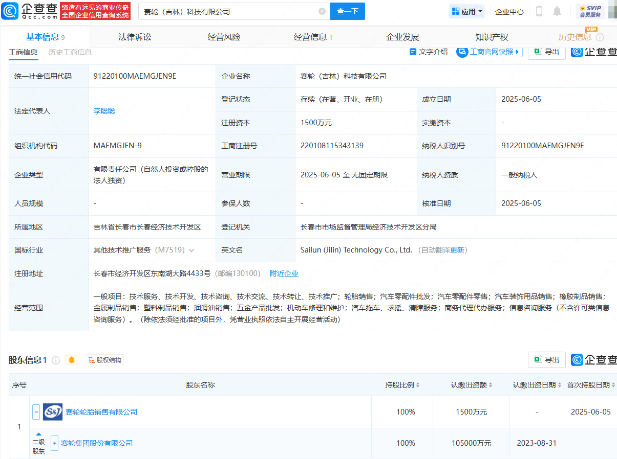 近日,赛轮(吉林)科技有限公司成立,法定代表人为李聪聪,注册资本为1500万元,经营范围包含:轮胎销售;汽车零配件批发;汽车零配件零售;汽车装饰用品销售;橡胶制品销售;金属制品销售;塑料制品销售;润滑油销售等。股权穿透显示,该公司由赛轮轮胎(601058)间接全资持股。