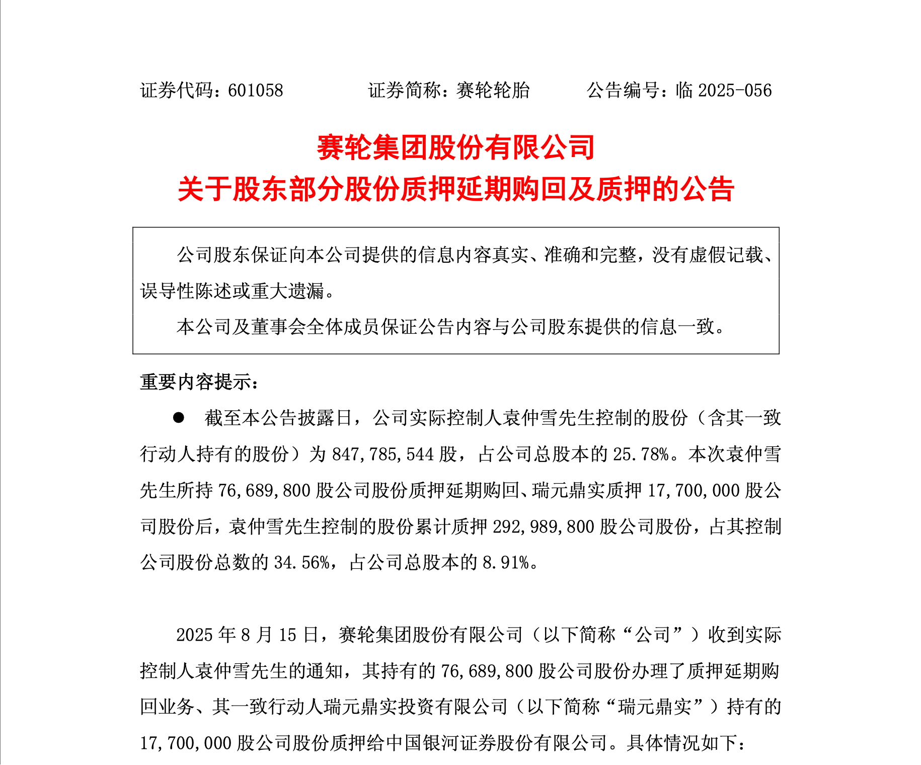 据公告披露,袁仲雪本次延期购回的7668.98万股股份市值8.96亿元,占其所持股份的34.13%,占赛轮轮胎总股本的2.33%。该笔股权原定于2025年8月19日到期,经与质权人国泰海通证券有限公司协商,购回日期延至2026年8月14日,质押融资用途为“偿还债务”。其一致行动人瑞元鼎实则将1770万股质押给中国银河证券股份有限公司,质押起始日为2025年8月14日,到期日为2027年8月13日,质押融资用途为“债权类投资”。
