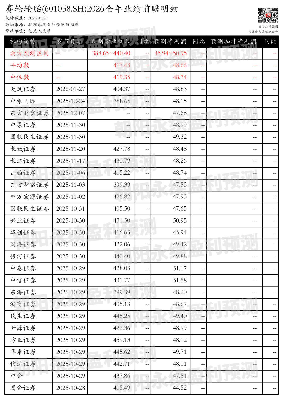 截至2026年01月28日,根据朝阳永续季度业绩前瞻数据: