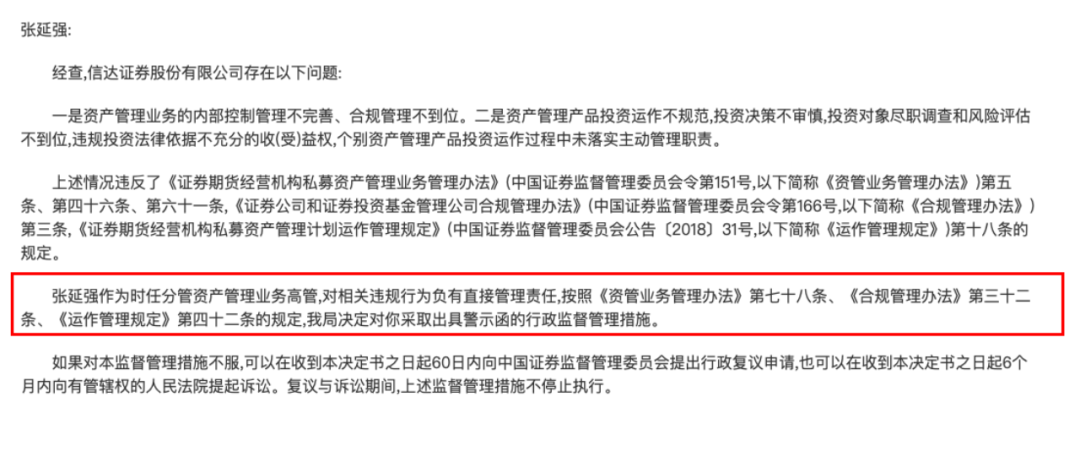 北京证监局还表示,张延强作为信达证券时任分管资产管理业务高管,对上述相关违规行为负有直接管理责任。于是,北京证监局也对张延强采取出具警示函的行政监督管理措施。