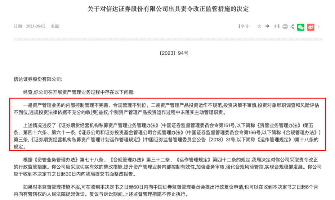 6月2日,北京证监局指出,信达证券在开展资产管理业务过程内部控制管理不完善、资产管理产品投资运作不规范,因而要求信达证券责令改正,时任分管资产管理业务高管也被“点名”。