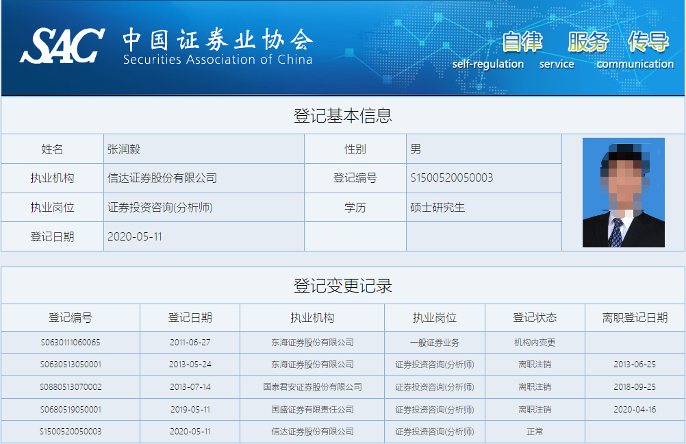 记者查询后发现,中国证券业协会网站公示的信达证券股份有限公司从业人员中,仅有一位从业人员的姓名为“张润毅”,其2011年6月27日登记执业岗位为一般证券业务,执业机构为东海证券股份有限公司,登记状态为机构内变更;2013年5月24日登记执业岗位为证券投资咨询(分析师),执业机构为东海证券股份有限公司,登记状态为离职注销;2013年7月14日登记执业岗位为证券投资咨询(分析师),执业机构为国泰君安证券股份有限公司,登记状态为离职注销;2019年5月11日登记执业岗位为证券投资咨询(分析师),执业机构为国盛证券有限责任公司,登记状态为离职注销;2020年5月11日登记执业岗位为证券投资咨询(分析师),执业机构为信达证券股份有限公司,登记状态为正常。
