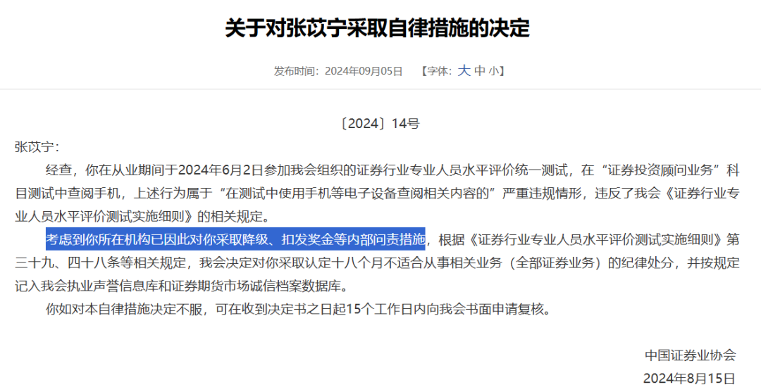 自律处罚函载明,当事人于2024年6月2日参加中证协组织的证券行业专业人员水平评价统一测试,在“证券投资顾问业务”科目测试中查阅手机。