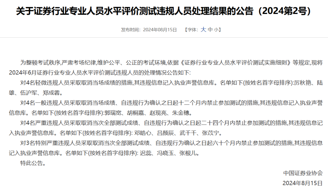 经认定,上述行为属于《证券行业专业人员水平评价测试实施细则》规定的“严重违规”情形,中证协已采取取消当次全部测试成绩、二十四个月内禁止参加测试的措施,其违规信息记入执业声誉信息库。