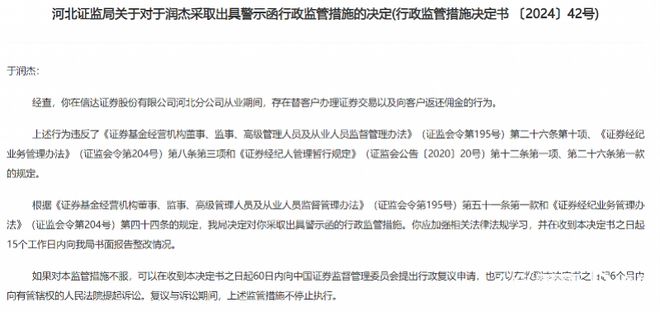12月4日,信达证券河北分公司从业人员因存在替客户办理证券交易以及向客户返还佣金的违规行为,被河北证监局采取出具警示函的行政监管措施。河北证监局表示,信达证券从业人员应加强相关法律法规学习,并在收到本决定书之日起15个工作日内向河北证监局提交书面报告整改情况。